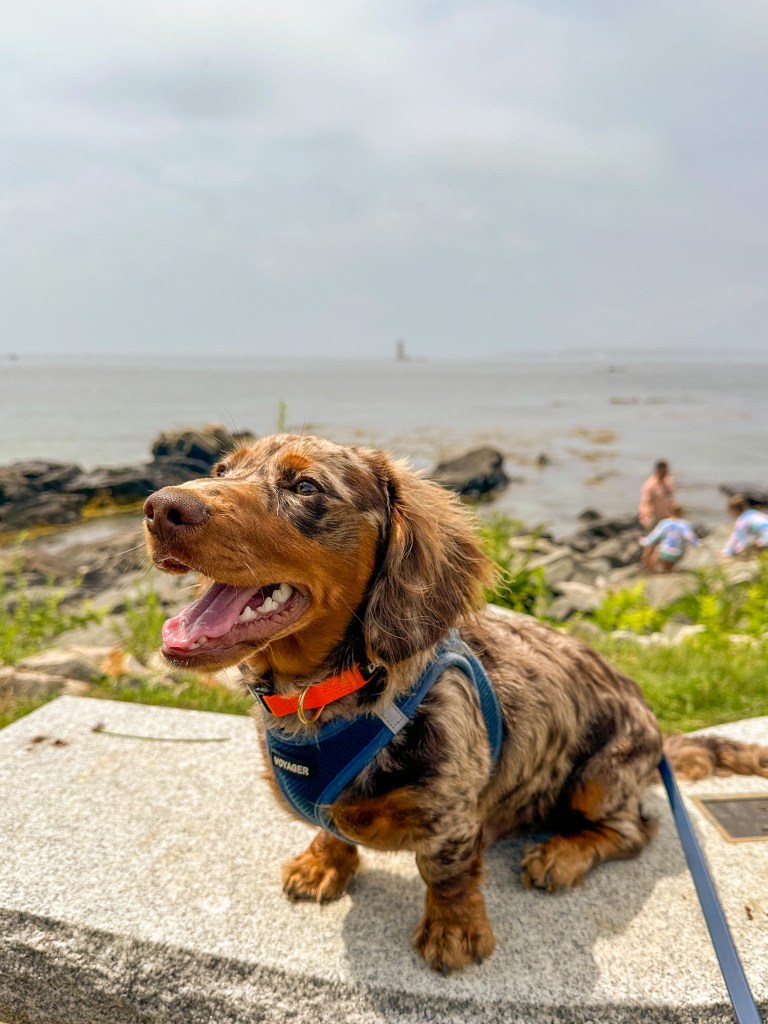 Our first stop was Fort Foster in Kittery Point. Fort Foster is a gorgeous park that happens to have several dog friendly beaches, picnic areas, a fishing pier, bathrooms, walking trails, etc. When you arrive at the parking lot, there is signage that says the dog friendly beach is to the right of the pier and dogs are prohibited on the beach to the left of the pier. Both of the beaches are small, and what the signs don’t say is that there are several beaches further down to the left which are larger, sandier, and all dog friendly. So we’d suggest walking down to the left a ways. You’ll have plenty of room to roam.