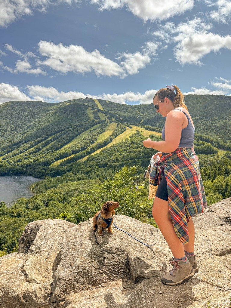 After about 1/2 mile of hiking, you’ll reach the Artist’s Bluff lookout with its stunning views of Franconia Notch. Be careful up here, there are steep cliffs. We’ve been working on being off-leash, but the rules don’t allow it and my humans didn’t trust me not to “explore” a little too deep into the woods or close to the edge of a cliff.